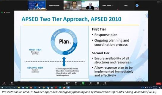 Indonesia participated in the meeting of the bi-regional Technical Advisory Group (TAG) of the Asia Pacific Strategy for Emerging Diseases and Public Health Emergencies (APSED) from 27-29 July 2021.  Around 190 participants from countries of South East Asia (SEAR) and Western Pacific Regions (WPR) attended the meeting.